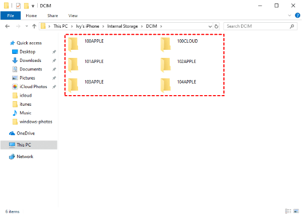 Step 4. Open the folder named "DCIM." This is where your iPhone stores all camera photos and videos. You will see subfolders with names like 100APPLE, 101APPLE, etc.