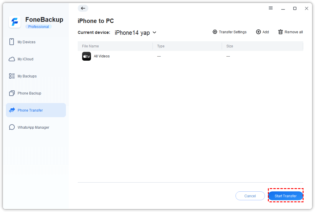 Step 5. Click "Start Transfer." (Optional: Click "Transfer Settings" first to choose a specific destination folder on your PC). The transfer will begin immediately.