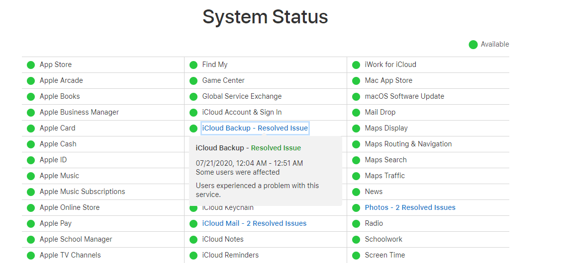 Step 1. Visit apple.com/support/systemstatus in a browser.