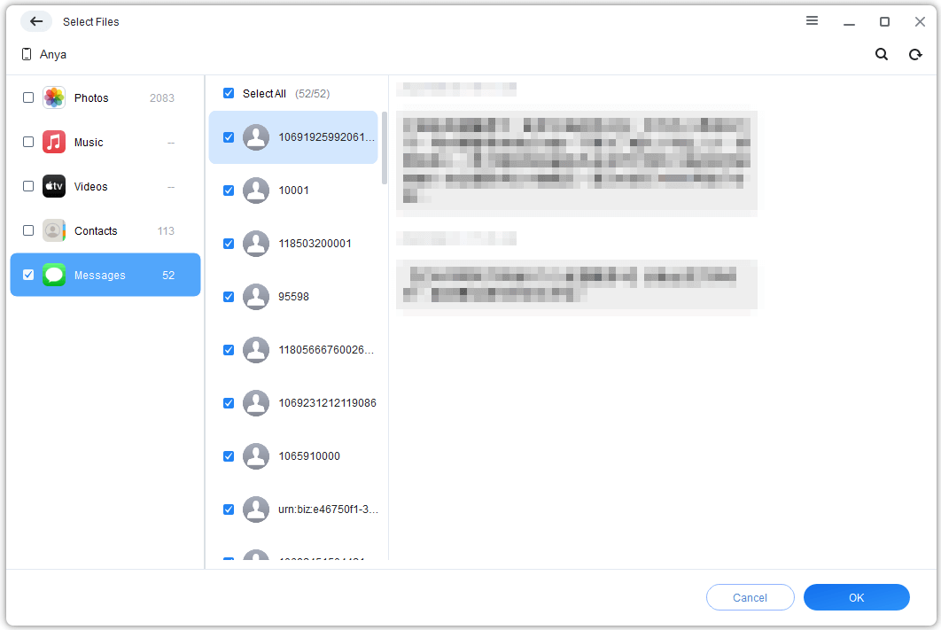 Step 3. Click to open the Messages preview. Select the specific conversations or individual messages you want to transfer. Click OK when you're done.