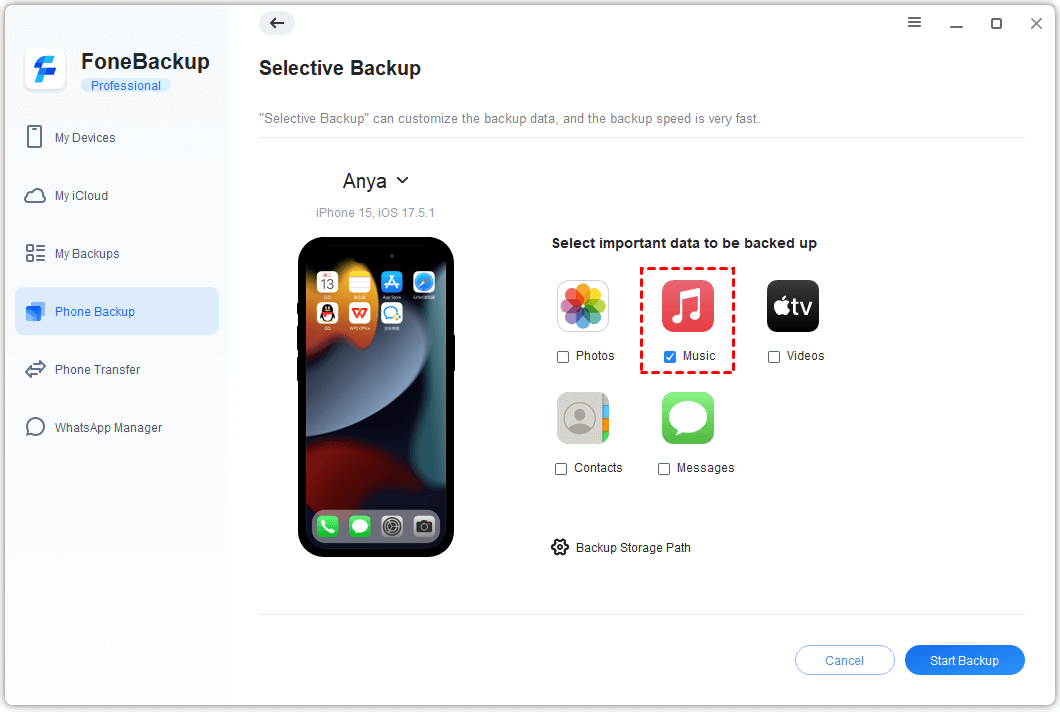 Step 4. Pick a folder on your computer to save the backup. (You can change this in Backup Storage Path if needed.)