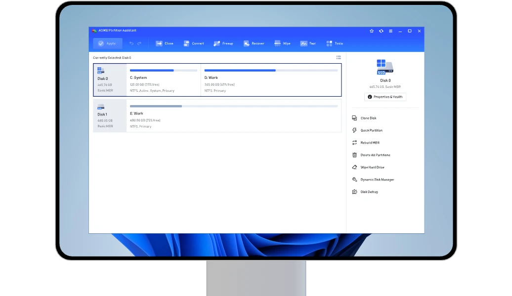 Manage disks and partitions with powerful yet easy-to-use tools. Resize partitions and convert disks to optimize storage usage and overall system performance.
