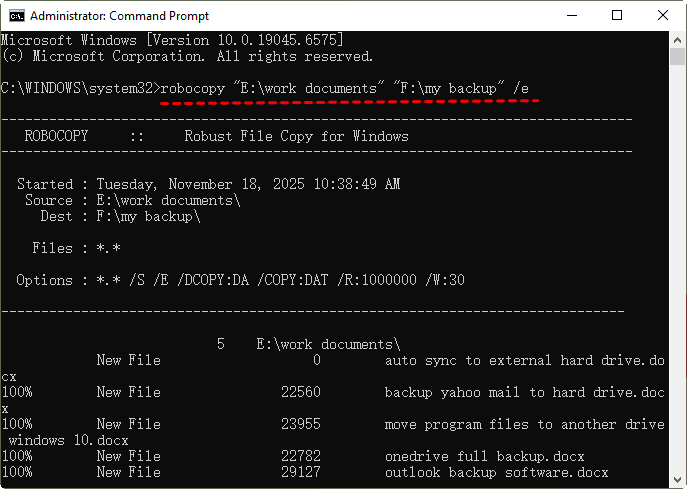 robocopy "E:\work documents" "F:\my backup" /e