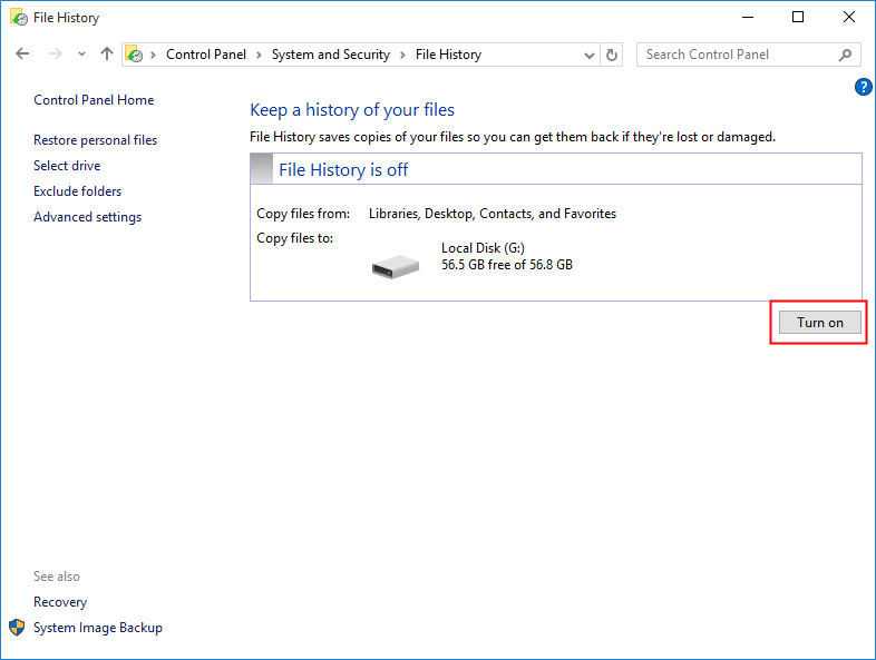 3. File History will choose your connected external drive for backups. Just click Turn on to start.