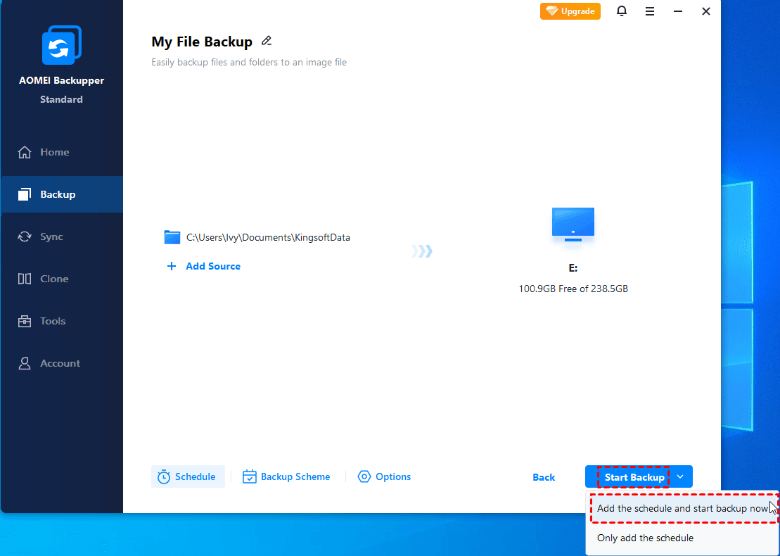 5. Click Start Backup > Add the schedule and start backup now to begin the process.