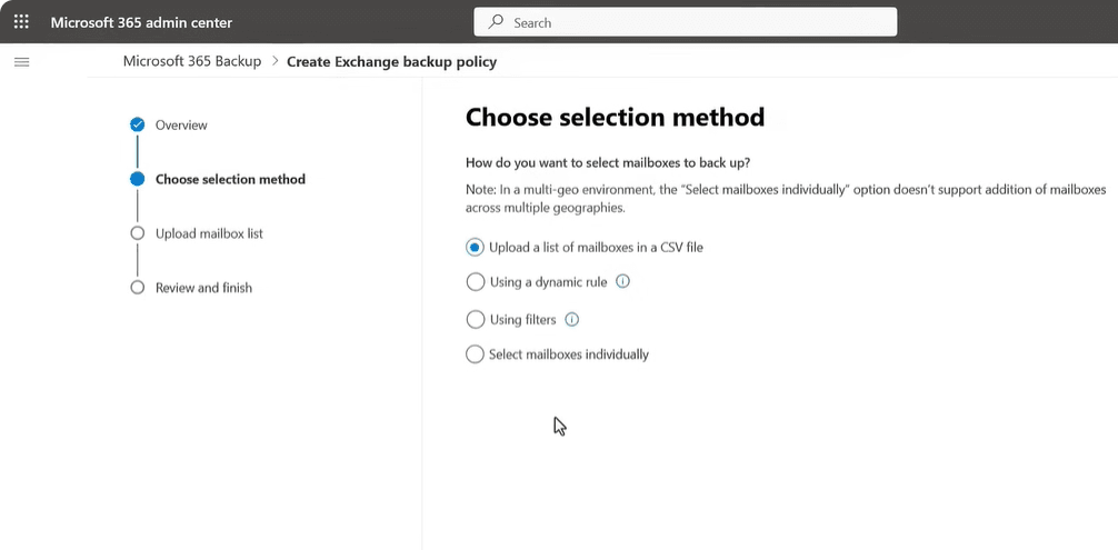 - Upload a list of mailboxes in a CSV file: Upload a list of accounts to back up via a CSV file.