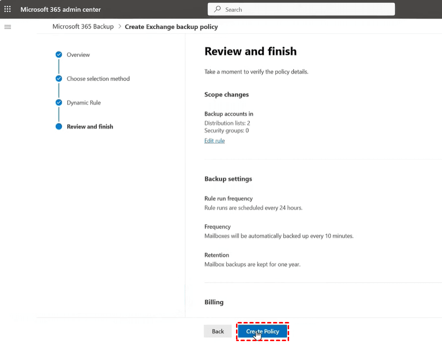 5. On the Review and finish page, review the information to make sure it's how you want it, and then select Create policy. The backup policy for Exchange is created.