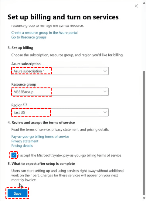 4. On the Set up billing and turn on services panel, select your Azure subscription, resource group, and region. Review and accept the terms of service, and then select Save.