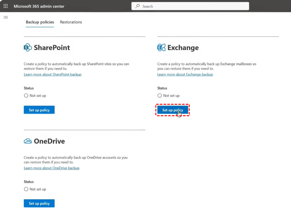 2. On the Microsoft 365 Backup page, in the Exchange section, select Set up policy.