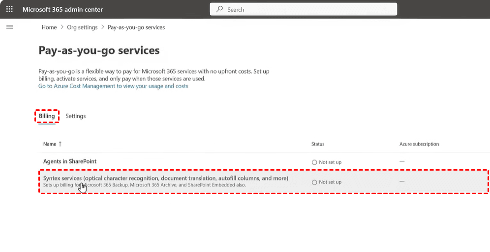 3. On the Pay-as-you-go services page, on the Billing tab, select Syntex services.