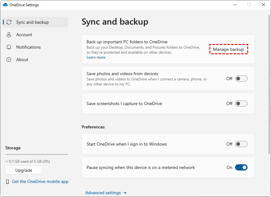 Step 3. In the OneDrive settings, go to Sync and backup > Manage backup.