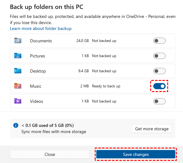 Step 4. Choose the folders you want to back up (Desktop, Documents, Pictures, etc.) and click Save changes. OneDrive will automatically sync selected folders to your cloud account.