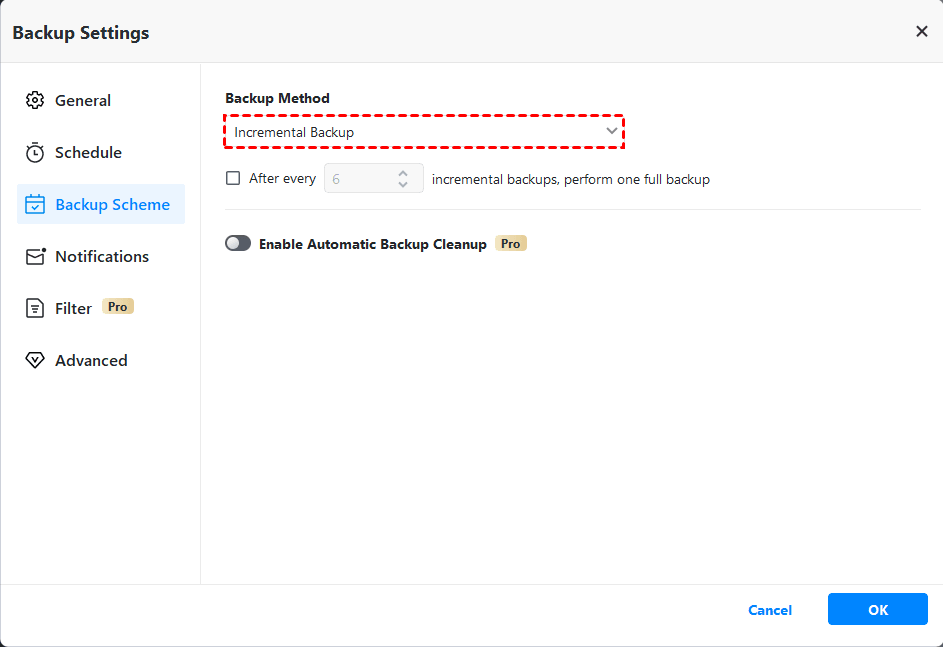 Step 3. Incremental backups are enabled by default to back up only new or changed files. It will create a full backup after 6 incremental backups, forming a set of full backups. Click Backup Scheme to confirm it.
