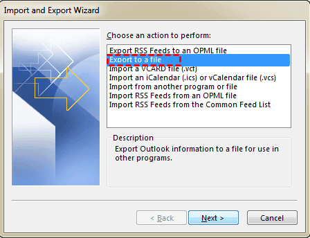 4. Choose Export to a file → Outlook Data File (.pst) → click Next.