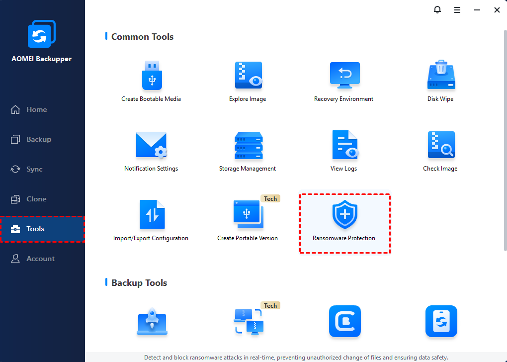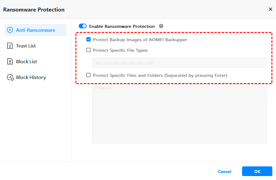 - Ransomware Protection - It protects backup files created with AOMEI Backupper, and your important file types & file/folder paths from ransomware.