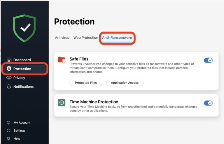 Step 1. Under the Protection section, open the Anti-Ransomware tab at the top. Then, click Safe Files, and toggle Safe Files to ON.