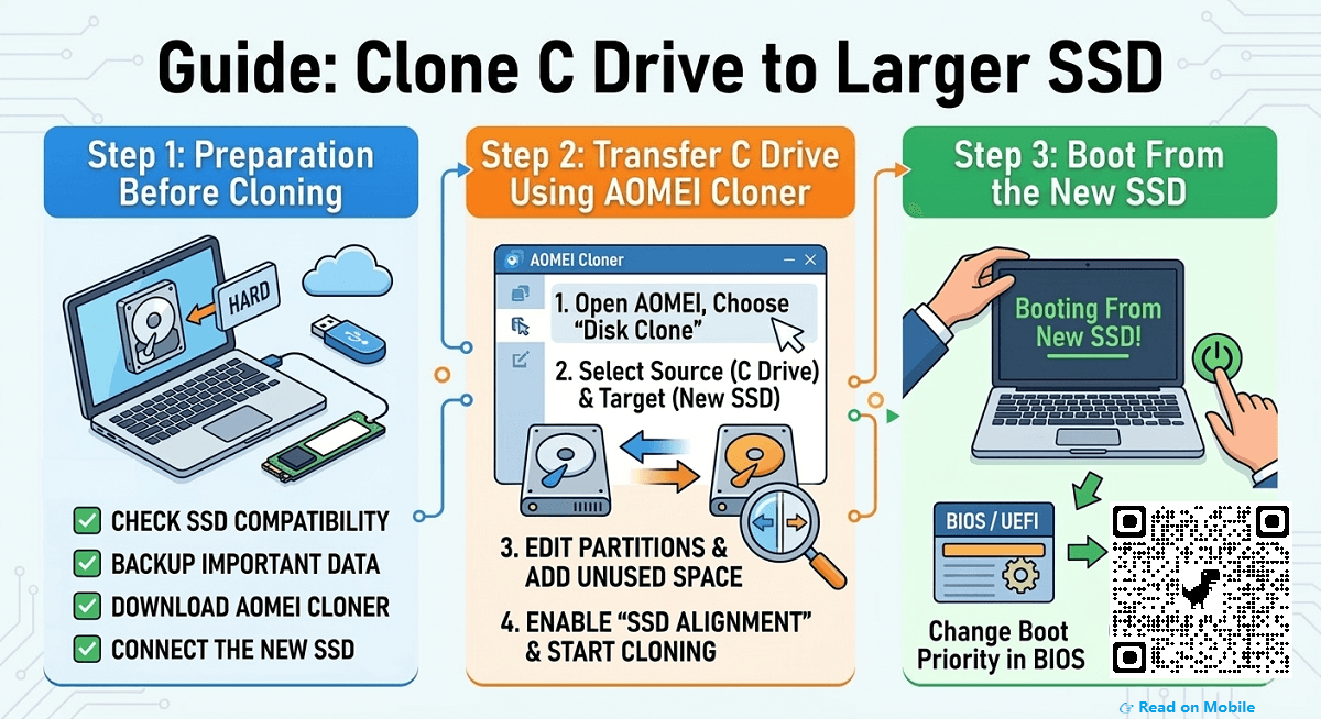 Cloning your C drive to a larger SSD boosts your storage and performance. Follow this simple guide to clone your system with AOMEI Cloner and keep all your files intact.