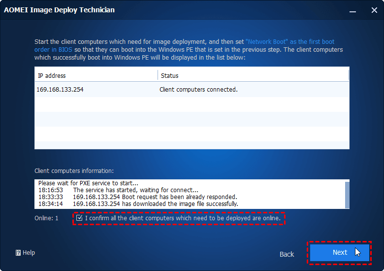 4. You can check the client computers’ status in AID. When all client computers show "Client computers connected", check I confirm all the client computers which need to be deployed are online. Then click Next.