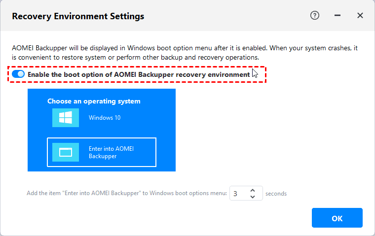 Step 2. In the Recovery Environment Settings window, switch on Enable the boot option of AOMEI Backupper recovery environment. Then set the standing time of the boot menu and click OK.