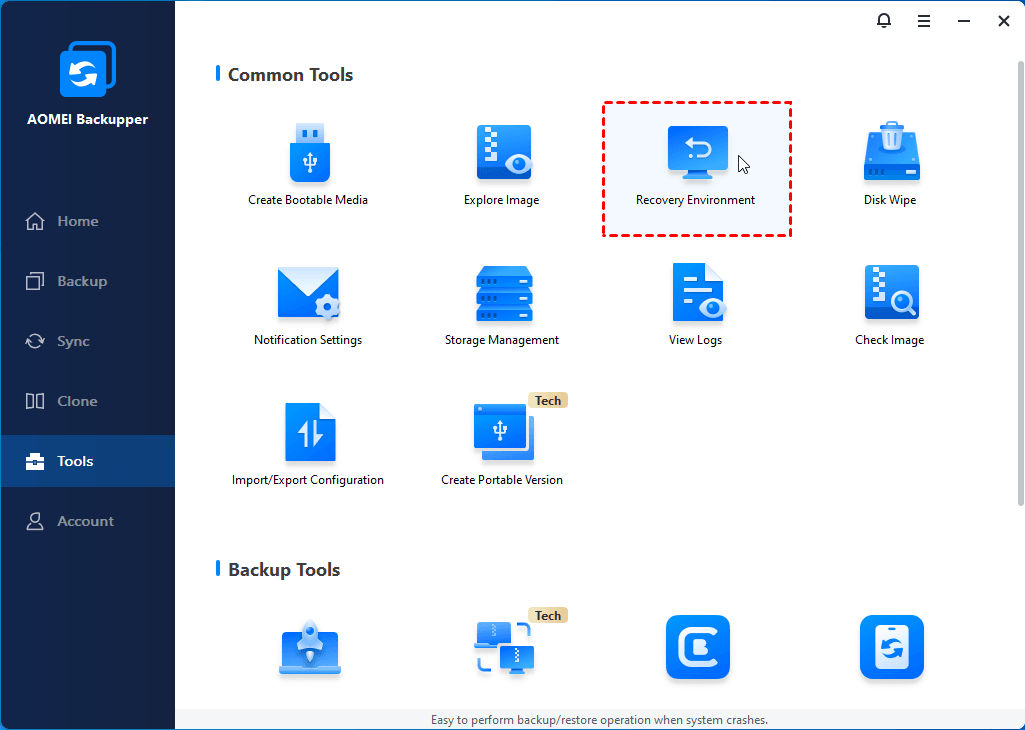Step 1. Install and launch AOMEI Backupper. Click Tools > Recovery Environment.