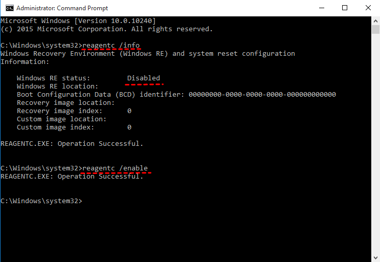 - If it shows Disabled, type reagentc /enable and press Enter to enable WinRE.