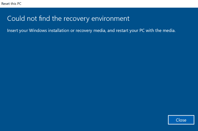 I go to Recovery -> Reset this PC -> Keep my files and I get this error ‘Could not find the recovery environment. Insert your Windows installation or recovery media, and restart your PC with the media’. Does anyone have a fix?"