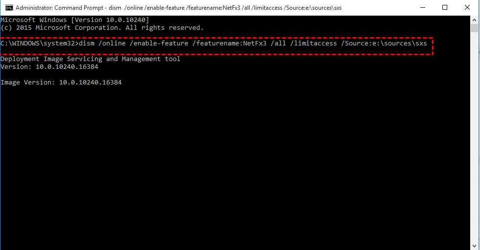 - DISM /Online /Enable-Feature /FeatureName:NetFx3 /All //LimitAccess /Source:E:sources\sxs