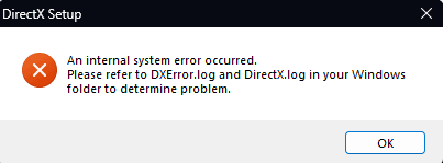 Hi. Yesterday, I upgraded from a Windows 10 Pro installation to a Windows 11 Enterprise installation. But I am having issues when trying to install DirectX; partway through the installation, it fails with the error: "An internal system error has occurred"