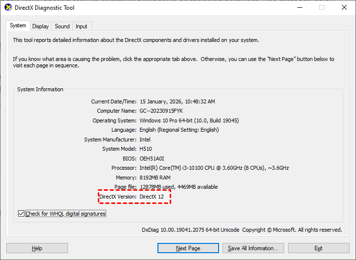 Step 2. Under the System tab, check the DirectX Version you have installed.