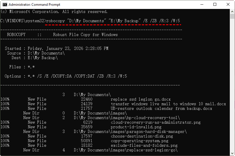 Robocopy (Robust File Copy) is Microsoft’s advanced file replication tool. Compared with Xcopy, Robocopy is faster, more resilient, and specifically designed to handle locked files, interruptions, and large or problematic transfers. Follow the steps below:
