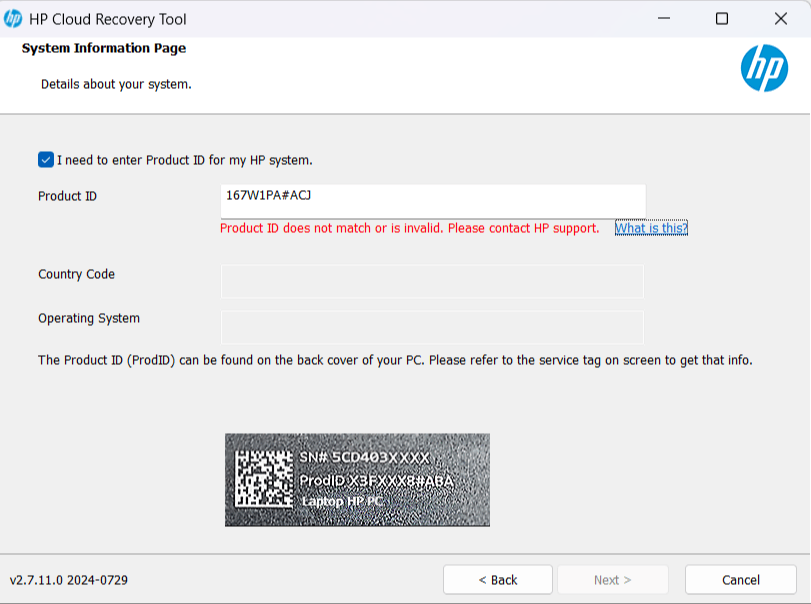 Case 1. HP Cloud Recovery Tool Product ID Invalid