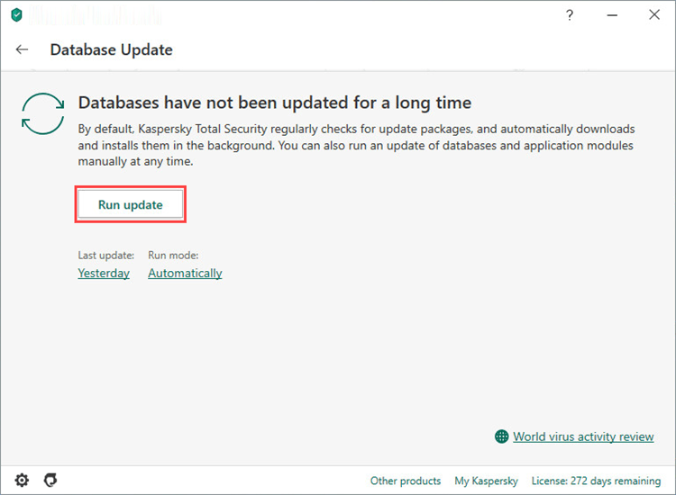 2️⃣ In the main window of Kaspersky Internet Security, click Database Update. And then, click Run update.
