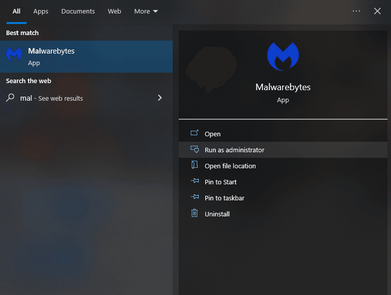 Sometimes Malwarebytes fails to open simply because it doesn’t have enough permission to start its background services. Running it as an administrator may help resolve this issue.