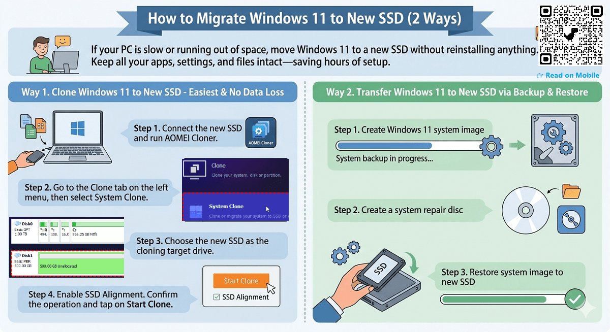 Migrating Windows 11 OS to a new SSD can be accomplished through multiple methods, each with its own advantages. Whether you opt for the quick and efficient cloning process using AOMEI Cloner or prefer the traditional Windows Backup and Restore approach, following the right steps ensures a smooth transition.