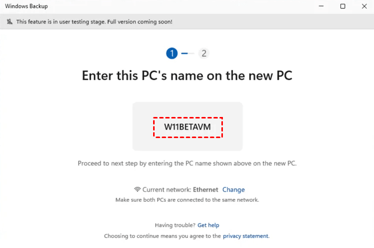 Step 2. On the old PC, you'll be asked to enter this PC's name on the new PC. Do it and click Next.