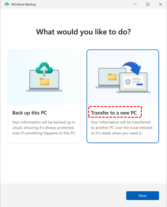 Step 1. Open the Windows Backup app. Then, select Transfer to a new PC and click Next.
