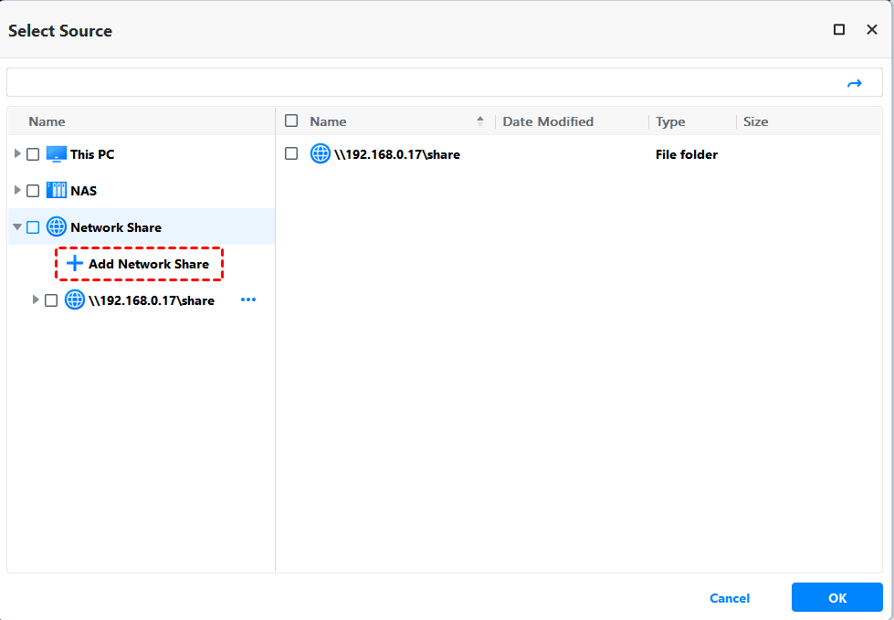 - Click Select Source and then Network Share > Add Network Share.