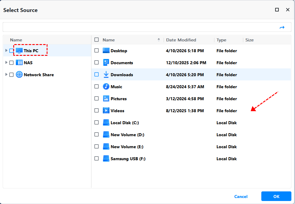 Step 2. Click Select Source to find files you want to move. Select This PC, Network Share, or NAS, depending on where the files are. Then, click the PC icon to select a destination.