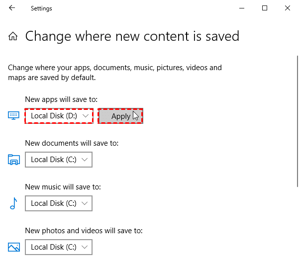 - Under New apps will save to, choose another drive (e.g., D: or E:). This ensures that supported apps are installed on the new drive automatically.