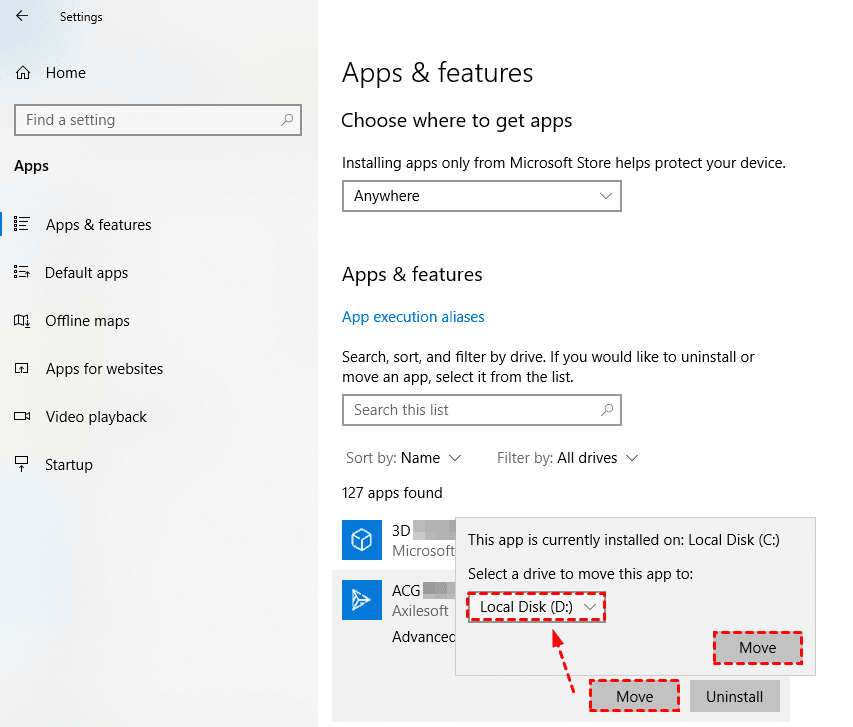 💡 Tip: Only apps downloaded from the Microsoft Store or designed for the Windows app model can be moved this way. Traditional desktop software (like Adobe or Office programs) will not show the Move button.