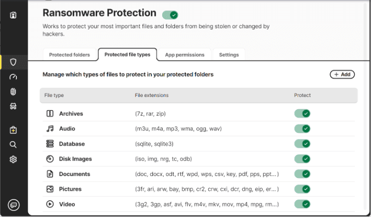 Step 4. And then click Add under Protected folders to add important folders to the protected list, or go to Protected file types to add types of files for protection.