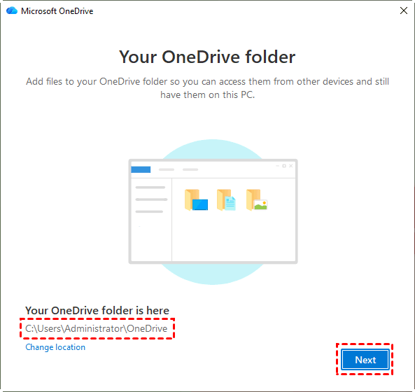 2. Choose your OneDrive folder location. By default, OneDrive stores synced files in C:\Users\[YourName]\OneDrive. Click Next to continue.