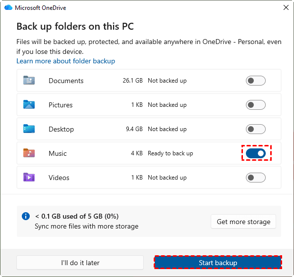 Note: OneDrive only offers 5GB of free storage. If the data you select exceeds the limit, click Get more storage to upgrade your plan.