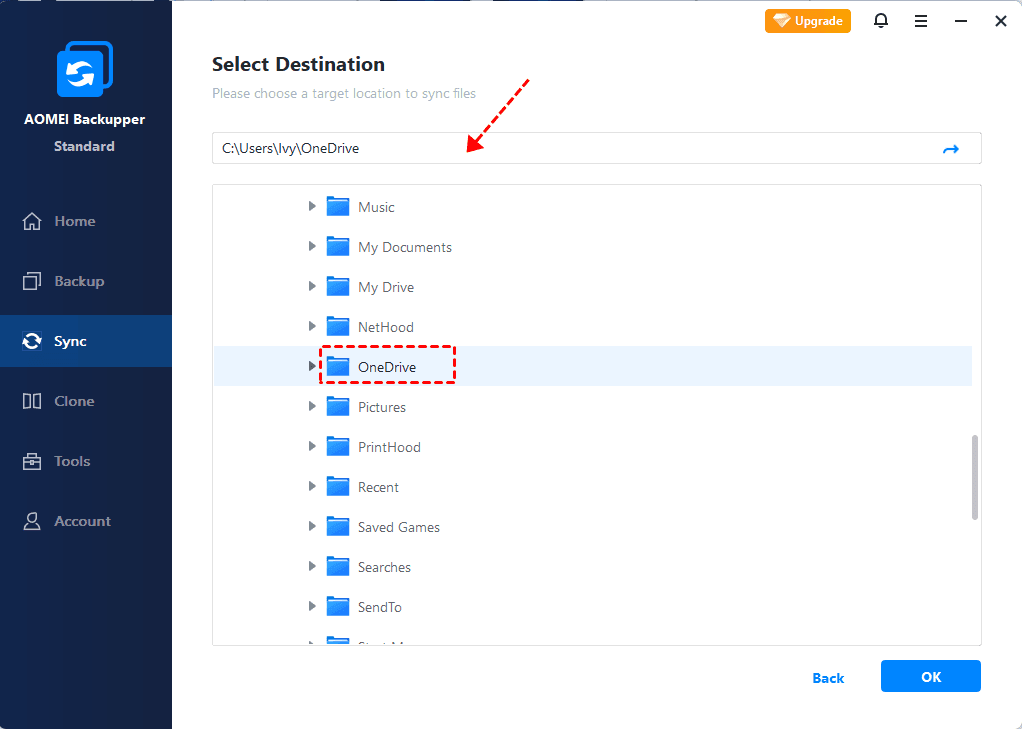 3. Click the destination box and select your OneDrive local folder as the target location.