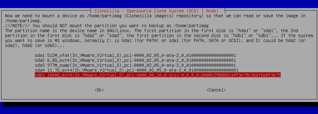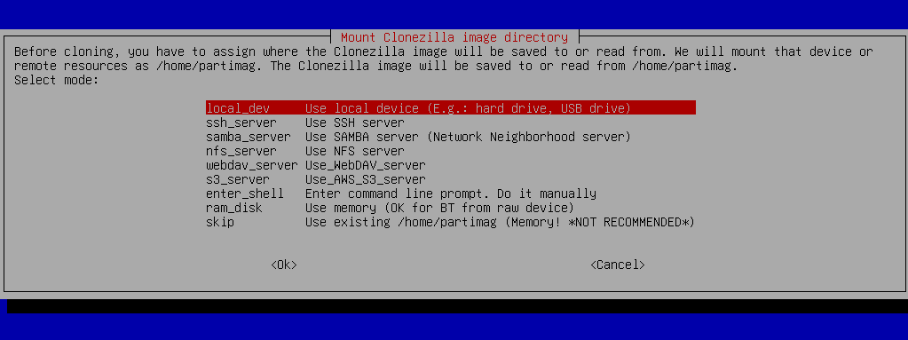 Clonezilla will ask where you want to store the image. You can choose from local_dev, samba_ server, nfs_server, etc. Follow the prompts to mount the storage where the image will be saved.