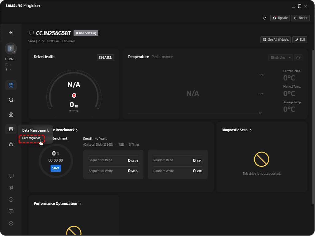 🙁Data Migration only supports Samsung-branded SSDs as the target drive. If you attempt to clone your system to an SSD from another manufacturer, the tool will refuse to proceed.