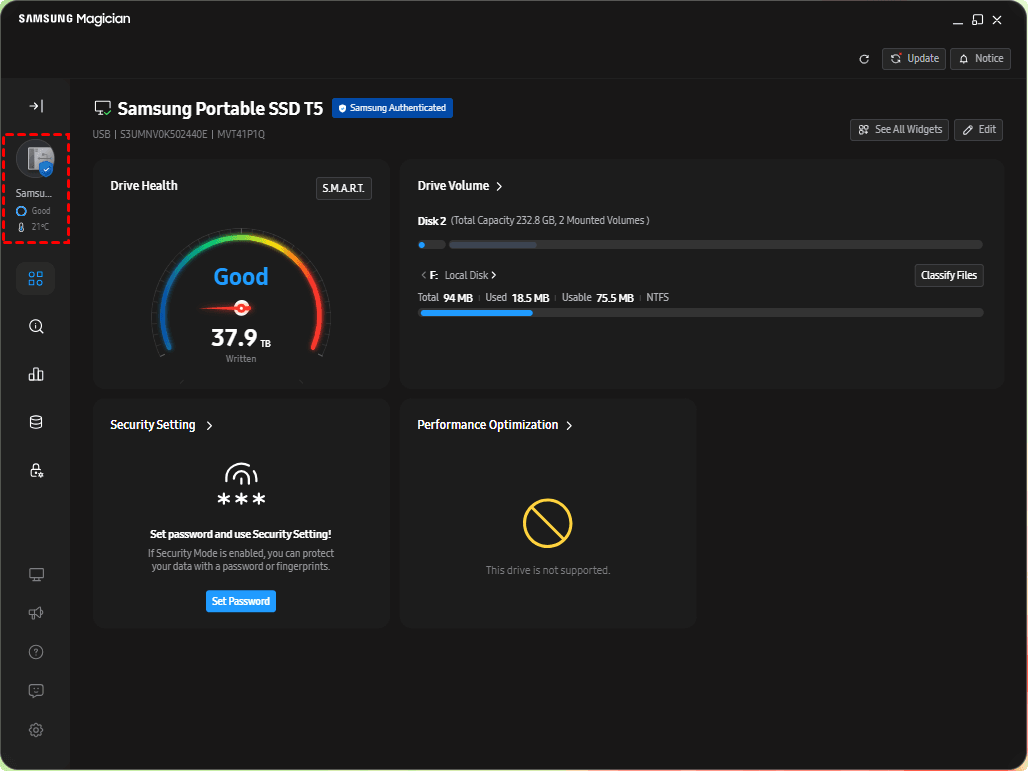2. Download, install, and launch Samsung Magician. From the left panel, click the disk section and select the current system disk from the disk list.