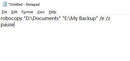 robocopy "D:\Documents" "E:\My Backup" /e /z