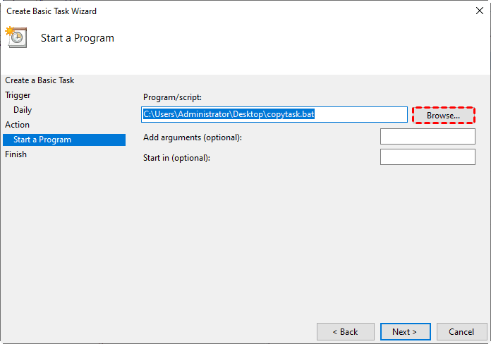 5. Click Browse to locate and select your batch file (copytask.bat) and click Next.