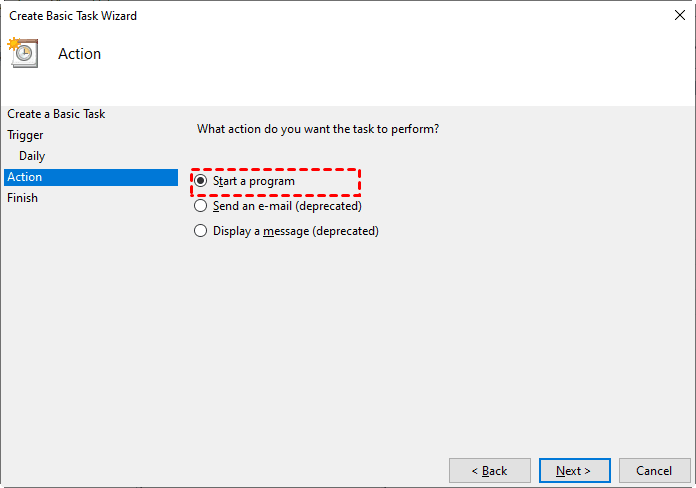 4. Select Start a program and click Next.